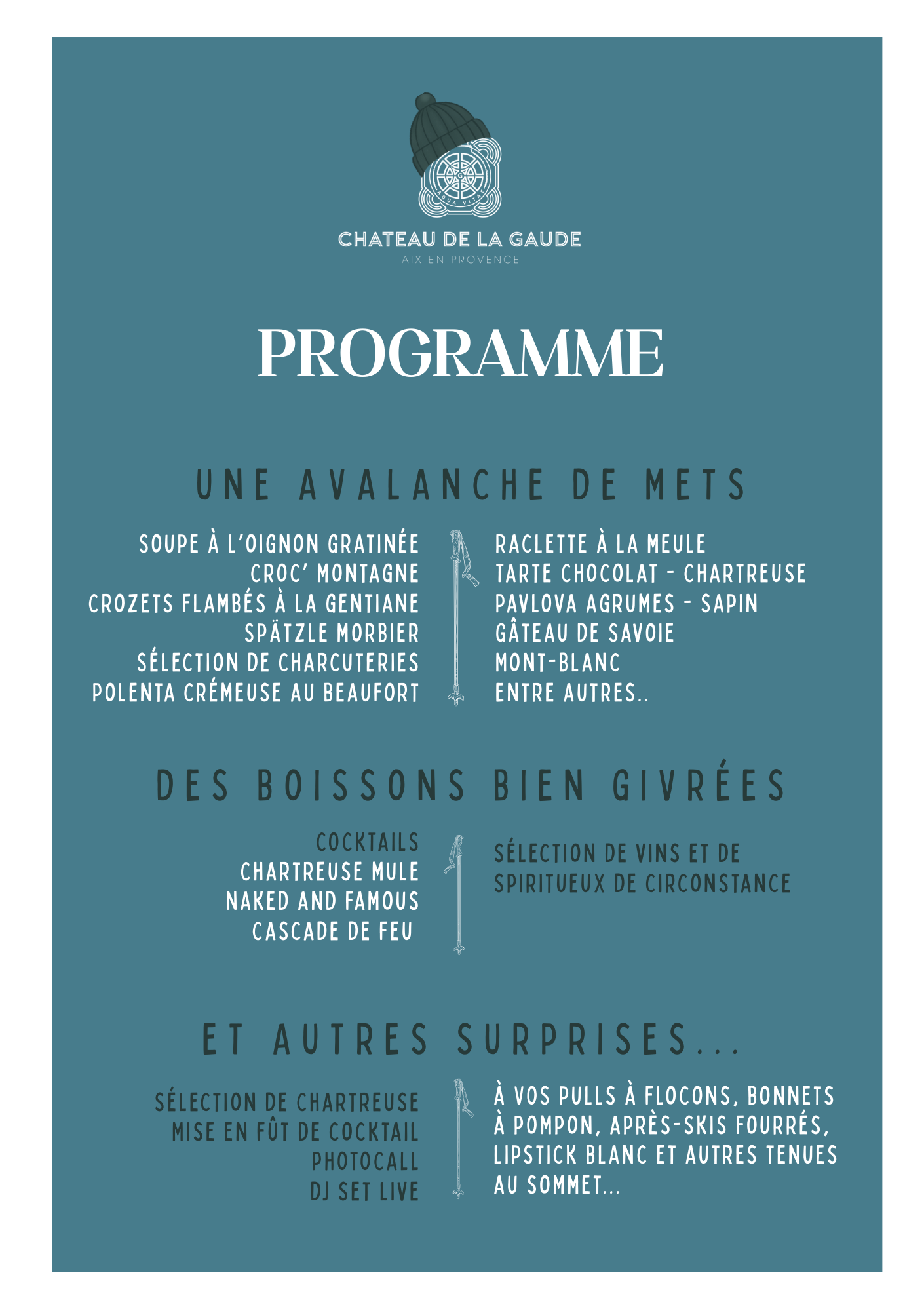 Un buffet convivial, mêlant classiques montagnards à des suggestions plus légères, pour finir sur des douceurs à faire fondre les plus résistants… Pour l'accompagner, une carte de boissons de circonstance, un DJ set live, une mise en fût de cocktail XXL , et autres surprises...