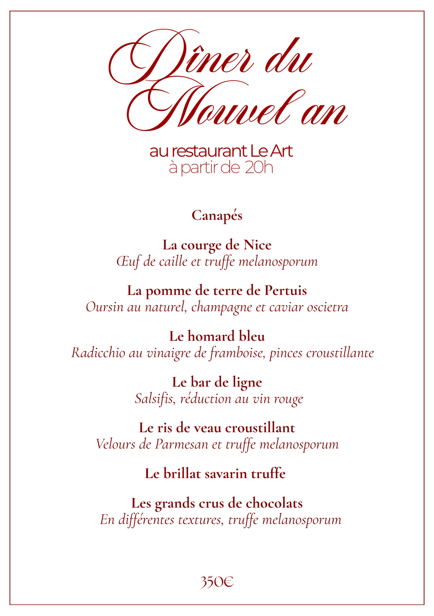 Laissez-vous séduire par un menu d'exception, conçu pour éveiller vos sens et sublimer chaque instant. Du homard bleu sublimé par un radicchio au vinaigre de framboise au ris de veau croustillant à la truffe melanosporum, chaque plat est une ode à la gastronomie.